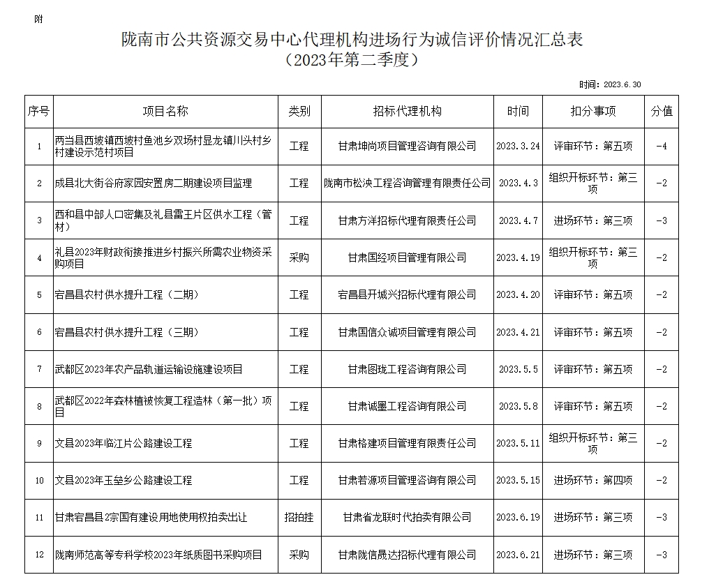 根據(jù)《甘肅省公共資源交易代理機構(gòu)管理辦法》(甘政辦發(fā)〔2019〕107號)和《隴南市公共資源交易中心代理機構(gòu)進場行為誠信評價實施制度(試行)》規(guī)定,現(xiàn)對2023年第二季度,共12家代理機構(gòu)12條進場行為誠信評價記錄予以通報(詳見附表)。請各代理機構(gòu)嚴(yán)格遵守各項規(guī)章制度、誠實守信,規(guī)范操作,為招標(biāo)人和采購人提供專業(yè)、高效、規(guī)范的招標(biāo)代理服務(wù)。