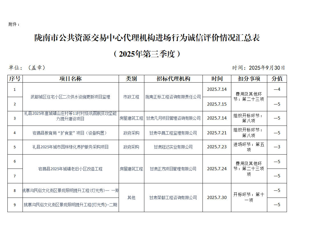 根據(jù)《隴南市公共資源交易中心代理機構進場行為誠信評價實施制度(試行)》規(guī)定,現(xiàn)對2025年第三季度共15家代理機構18條進場行為誠信評價記錄予以通報(詳見附表)。請各代理機構嚴格遵守各項規(guī)章制度、誠實守信,規(guī)范操作,為招標人和采購人提供專業(yè)、高效、規(guī)范的招標代理服務。