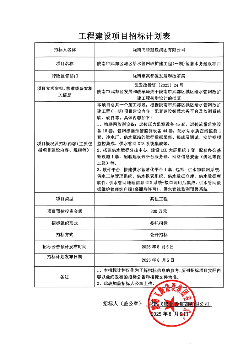 隴南市武都區(qū)城區(qū)給水管網(wǎng)改擴(kuò)建工程(一期)智慧水務(wù)建設(shè)項(xiàng)目