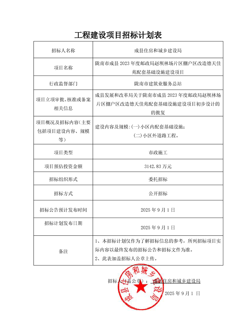 隴南市成縣2023年度郵政局趙壩林場片區(qū)棚戶區(qū)改造德天佳苑配套基礎設施建設項目