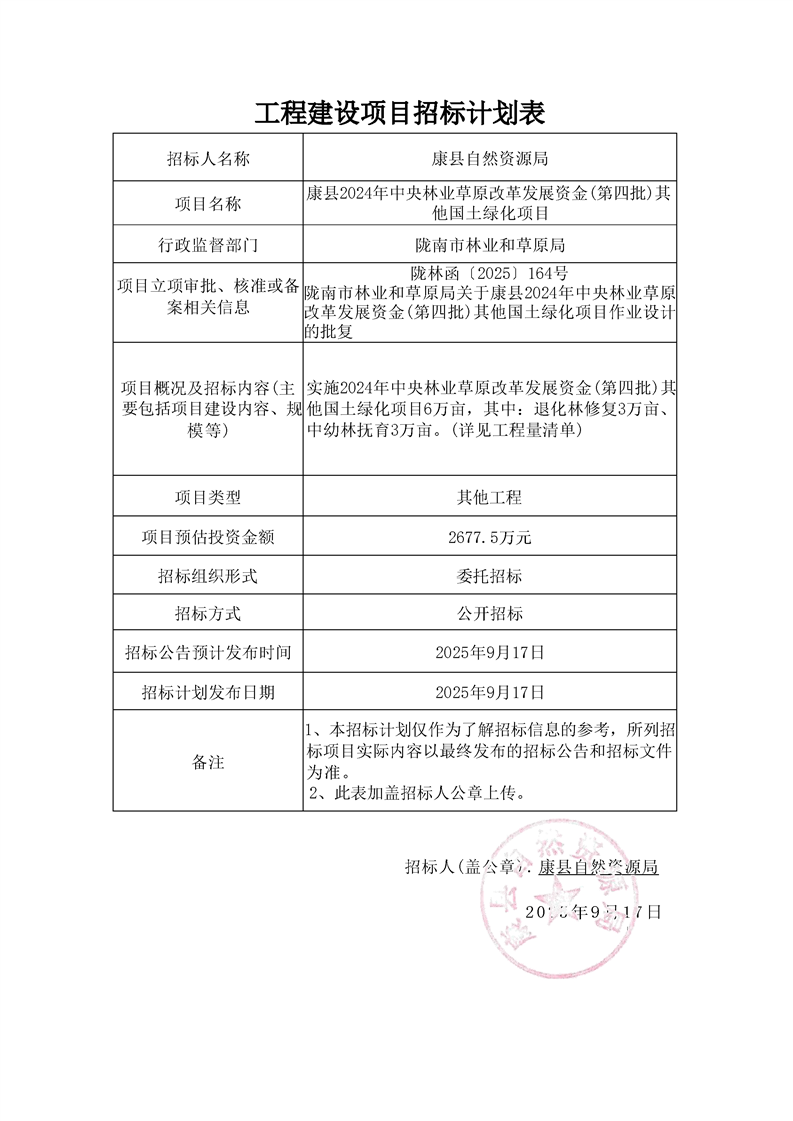 康縣2024 年中央林業(yè)草原改革發(fā)展資金(第四批)其他國(guó)土綠化項(xiàng)目