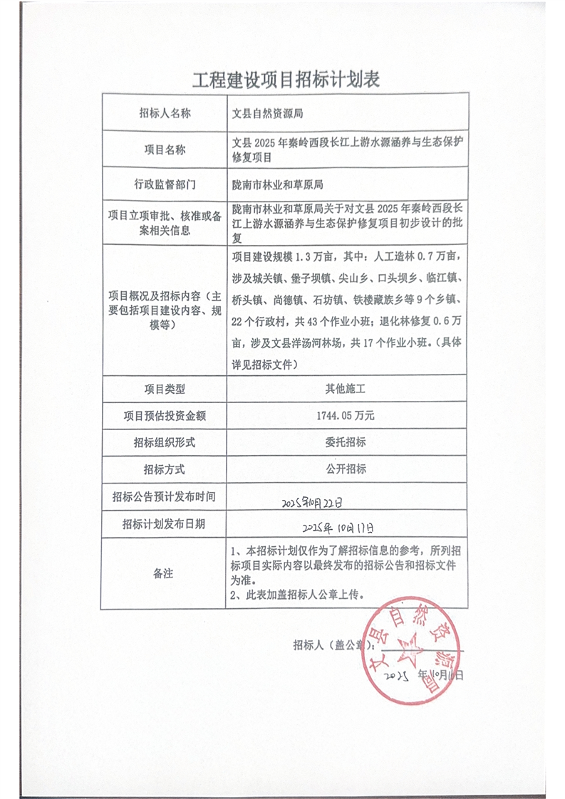 文縣2025年秦嶺西段長江上游水源涵養(yǎng)與生態(tài)保護(hù)修復(fù)項目