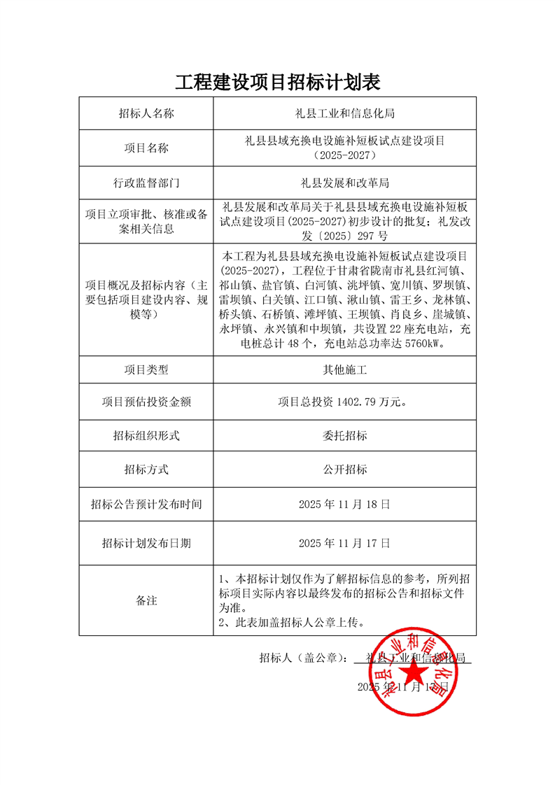 招標(biāo)計劃—禮縣縣域充換電設(shè)施補短板試點建設(shè)項目(2025-2027).pdf