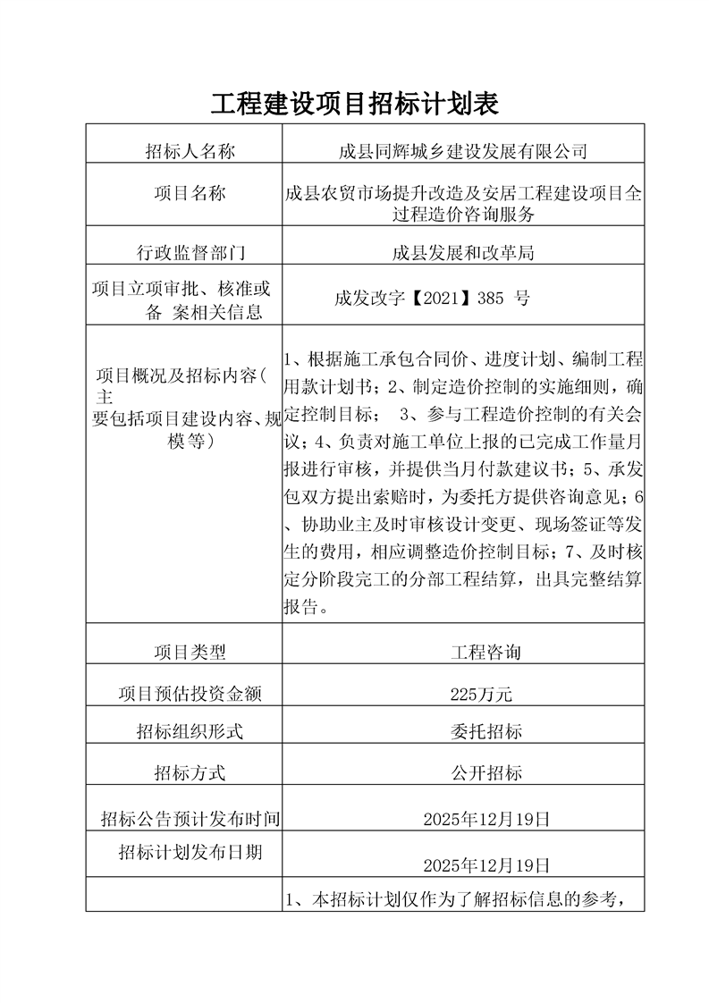 成縣農(nóng)貿(mào)市場提升改造及安居工程建設(shè)項(xiàng)目(一期)全過程造價(jià)咨詢服務(wù)