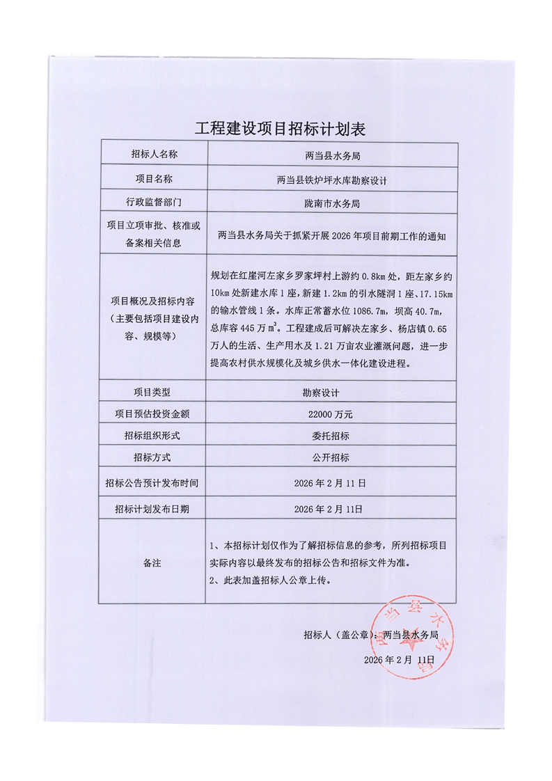 兩當(dāng)縣鐵爐坪水庫勘察設(shè)計(jì)